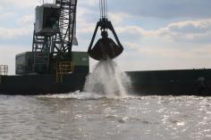 bisher nie zu Untiefen in der Fahrrinne kam. Das Baggerschiff entlädt seine Ladung nicht einfach am Neuer Lüchtergrund, sondern spült es zeitaufwendig in die neu geschaffene "Sonderdeponie"