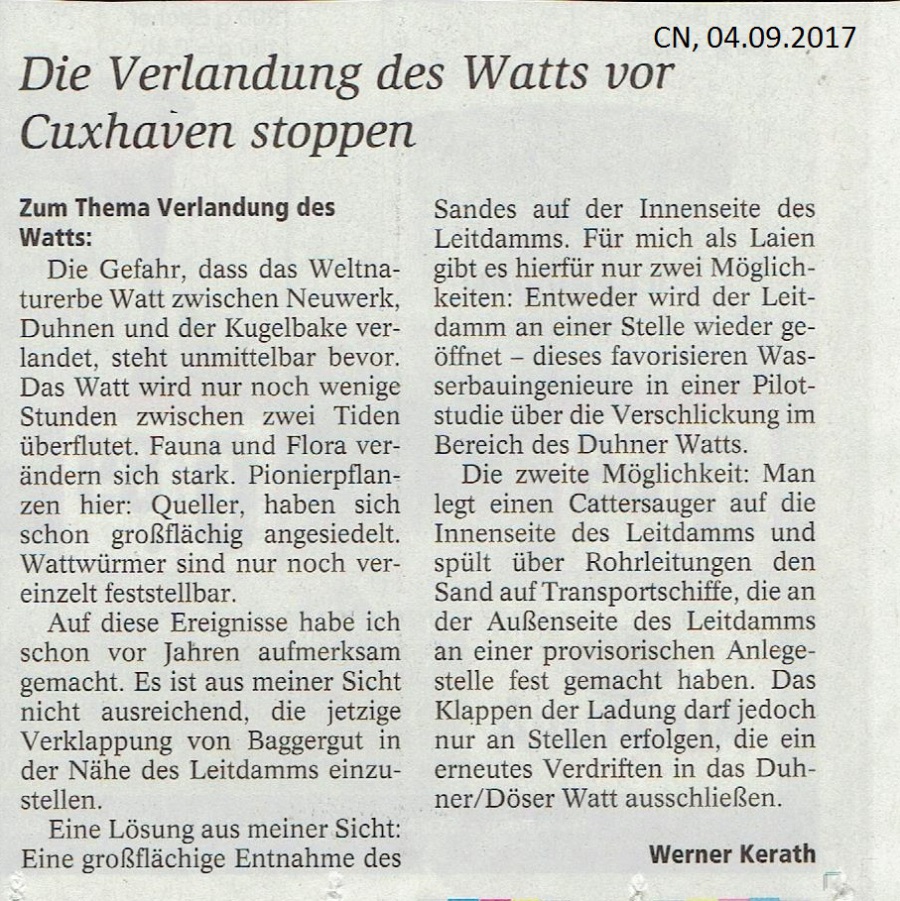 CN, 4. September 2017: "Die Verlandung des Watts vor Cuxhaven stoppen." Werner Kerath