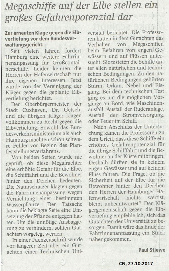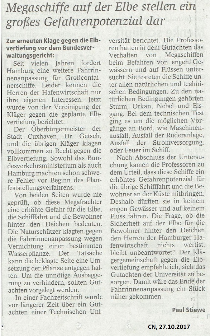 CN, 27.10.2017: "Megaschiffe auf der Elbe stellen ein großes Gefahrenpotential dar" von Paul Stiewe