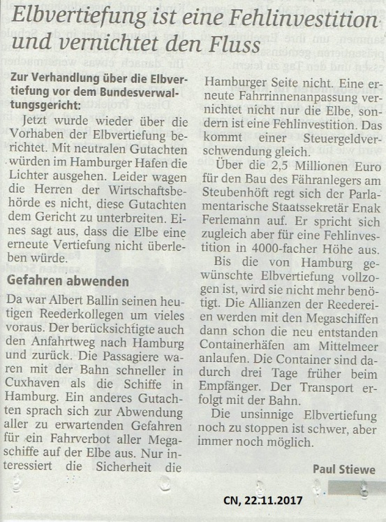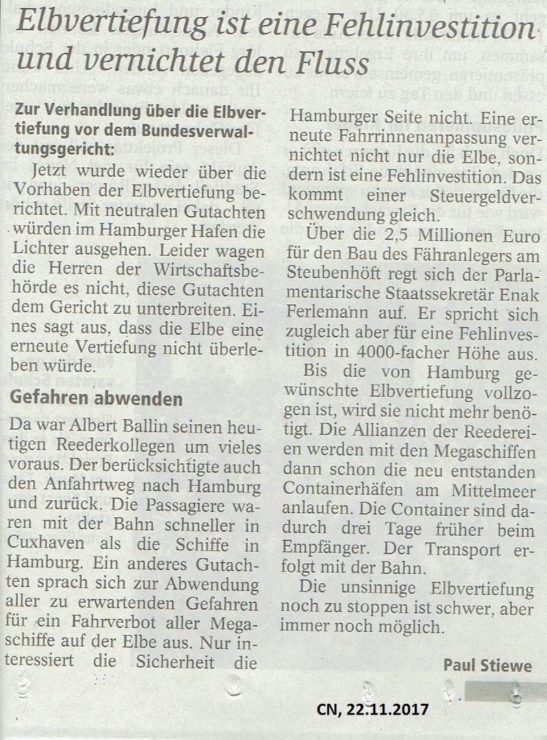 CN, 22. November 2017: "Elbvertiefung ist eine Fehlinvestition und vernichtet den Fluss" Paul Stiewe