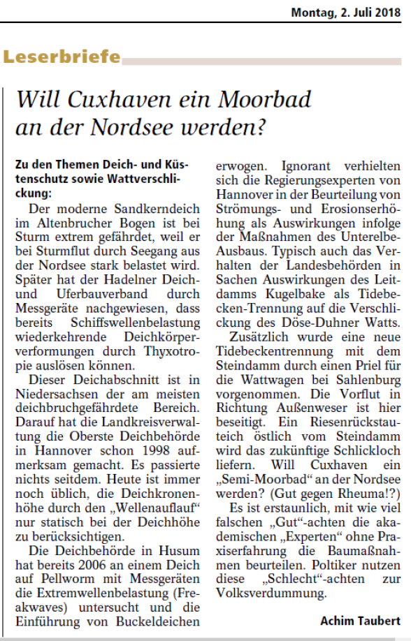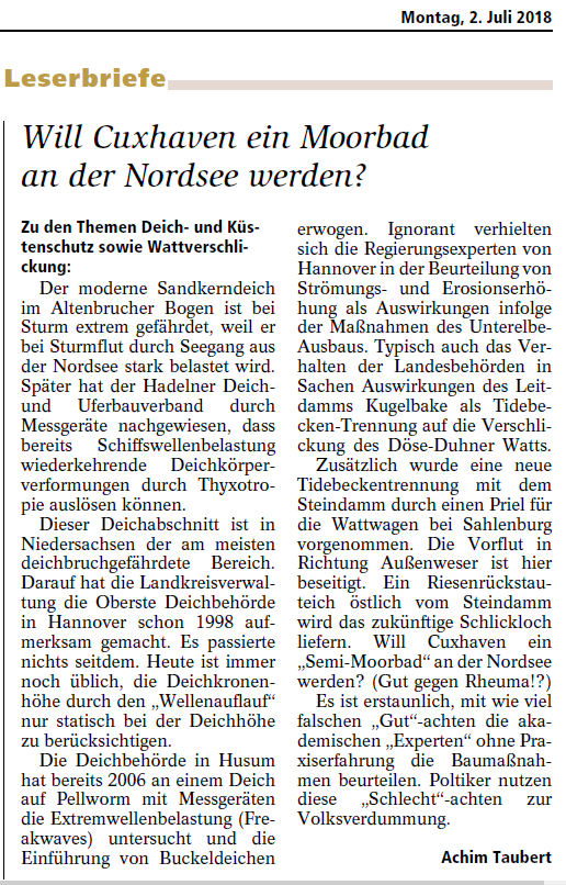 CN, 2. Juli 2018, Achim Taubert: "Will Cuxhaven ein Moorbad an der Nordsee werden?"