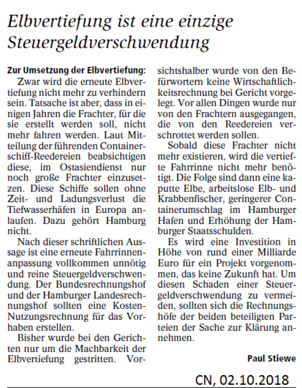 CN, 02.10.2018: "Elbvertiefung ist eine einzige Steuergeldver-schwendung von Paul Stiewe"