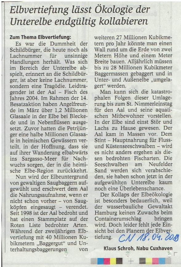 CN, 18.04.2019: "Elbvertiefung lässt Ökologie der Unterelbe endgültig kollabieren" von Klaus Schroh, Nabu Cuxhaven