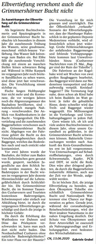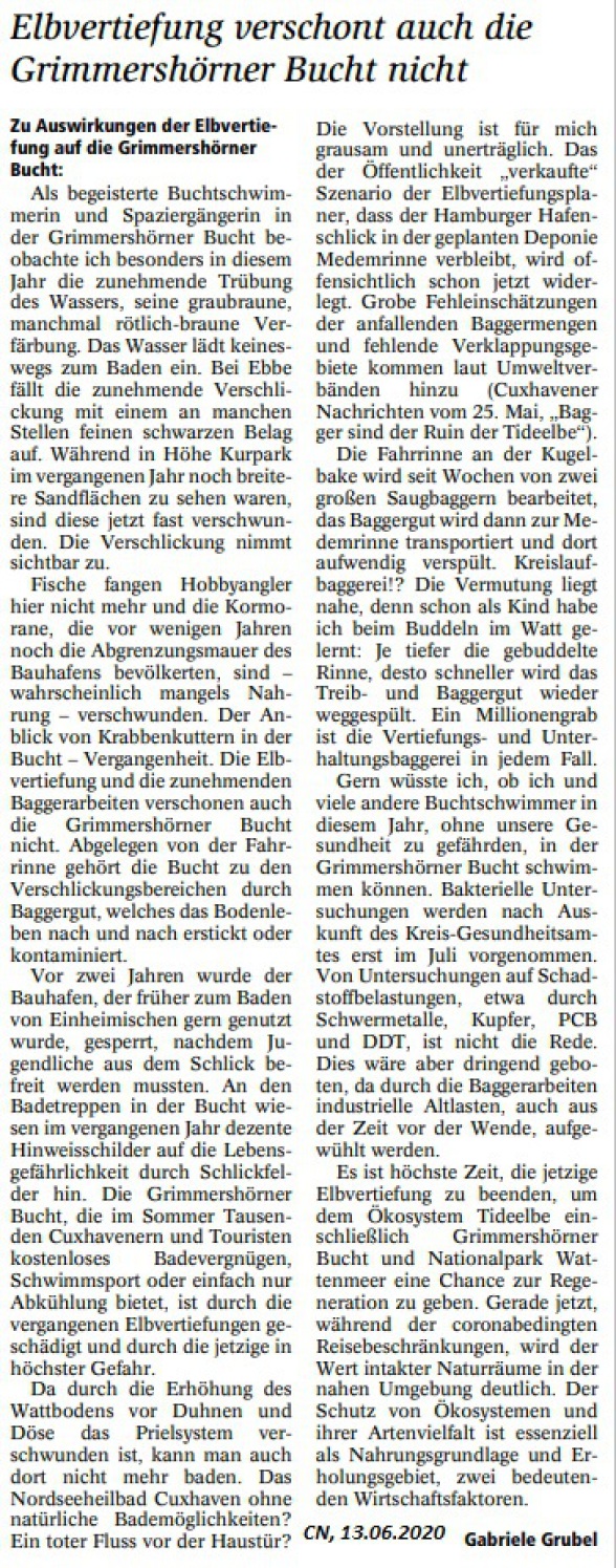 CN, 13.06.2020: "Elbvertiefung verschont auch die Grimmershörnbucht nicht" von Gabriele Grubel