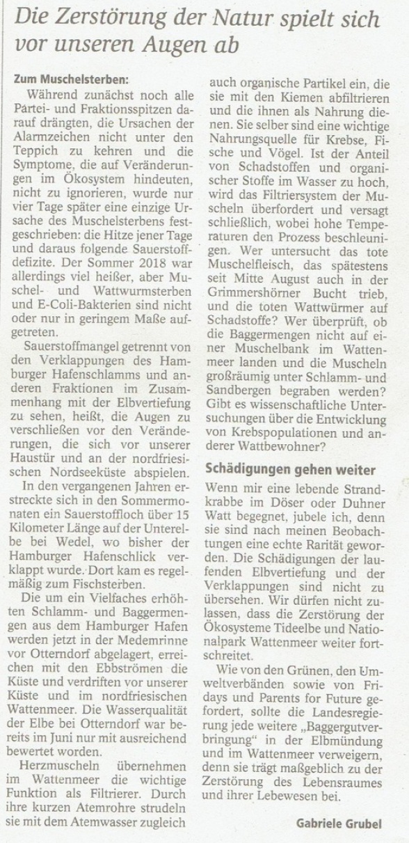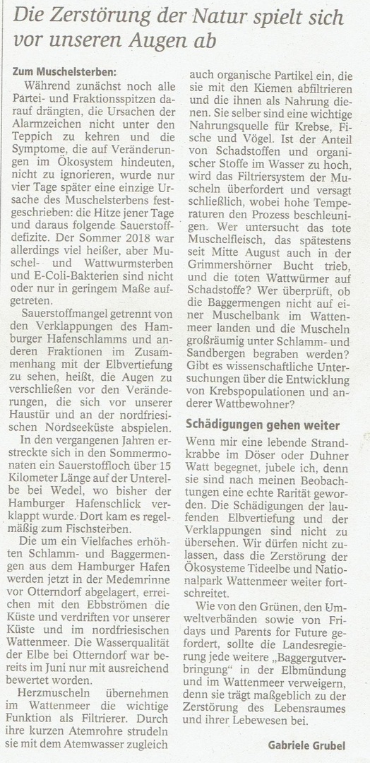 Die Schädigungen der laufenden Elbvertiefung und der Verklappungen sind nicht zu übersehen. Wir dürfen nicht zulassen, dass die Zerstörung der Ökosysteme Tideelbe und Nationalpark Wattenmeer weiter